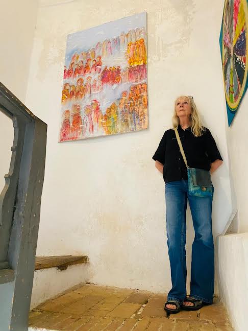 ich persönlich war mit dem gemälde „auf der flucht“ zur reihe „krieg“ dabei, größe 140×120 cm, material acrylfarbe, kohle, pastellkreide und bleistift auf leinwand. auf dem bild sind menschen zu sehen, die im kriegsgeschehen verwirrt einzeln aber meist in gruppen unterwegs sind im versuch, sich zu retten und dem unheil der willkürherrschaft zu entkommen.